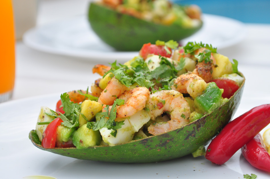 3. Corte os abacates ao meio, retire-lhes o caroço, regue-os com o restante sumo de limão e recheie-os com a mistura anterior.